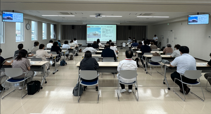 函館医療センターの病院職員をはじめ、市町内の医療・介護関係者等32名の方々に参加していただきました。終了後のアンケートでは、「退院後の生活の場について,患者さんやそのご家族から相談を受ける立場として,実際の支援の様子や生活環境の情報を得られ勉強になりました」(MSW)、「他施設のサービス内容,法的位置付け,利用料,役割を知る事ができた。」(看護師)「老健,グループホームの詳しい内容,料金が知ることができてよかった。種別は知っていても中身がわからなかったので良い機会でした。」(介護職員)などの感想をいただき、大変有意義な研修会となりました。