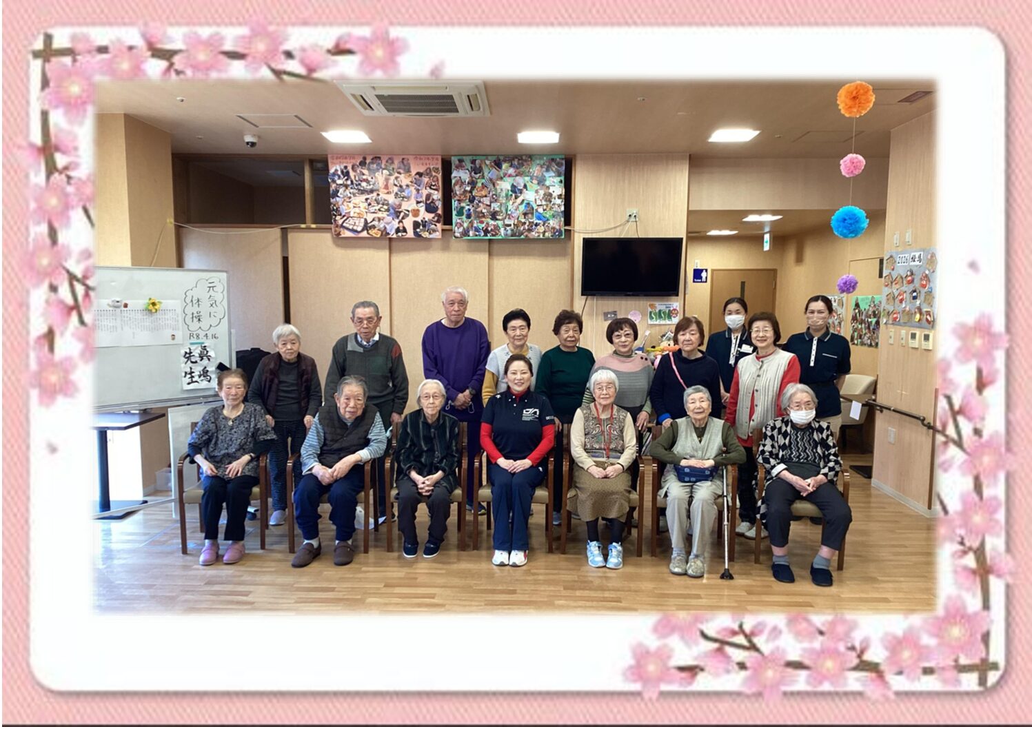 デイルームには皆さまで作られた桜の壁飾りが飾られ,記念撮影も楽しみました。街中でも桜が咲き始め,春の空気を感じながら,皆さまと素敵な時間を共有できたことに感謝いたします。