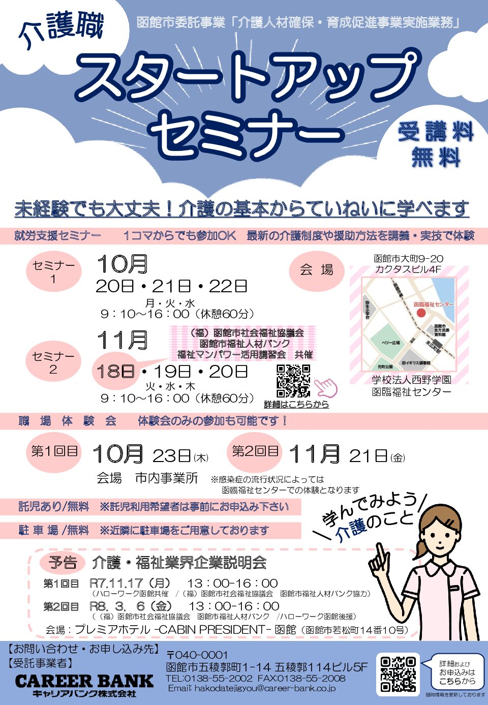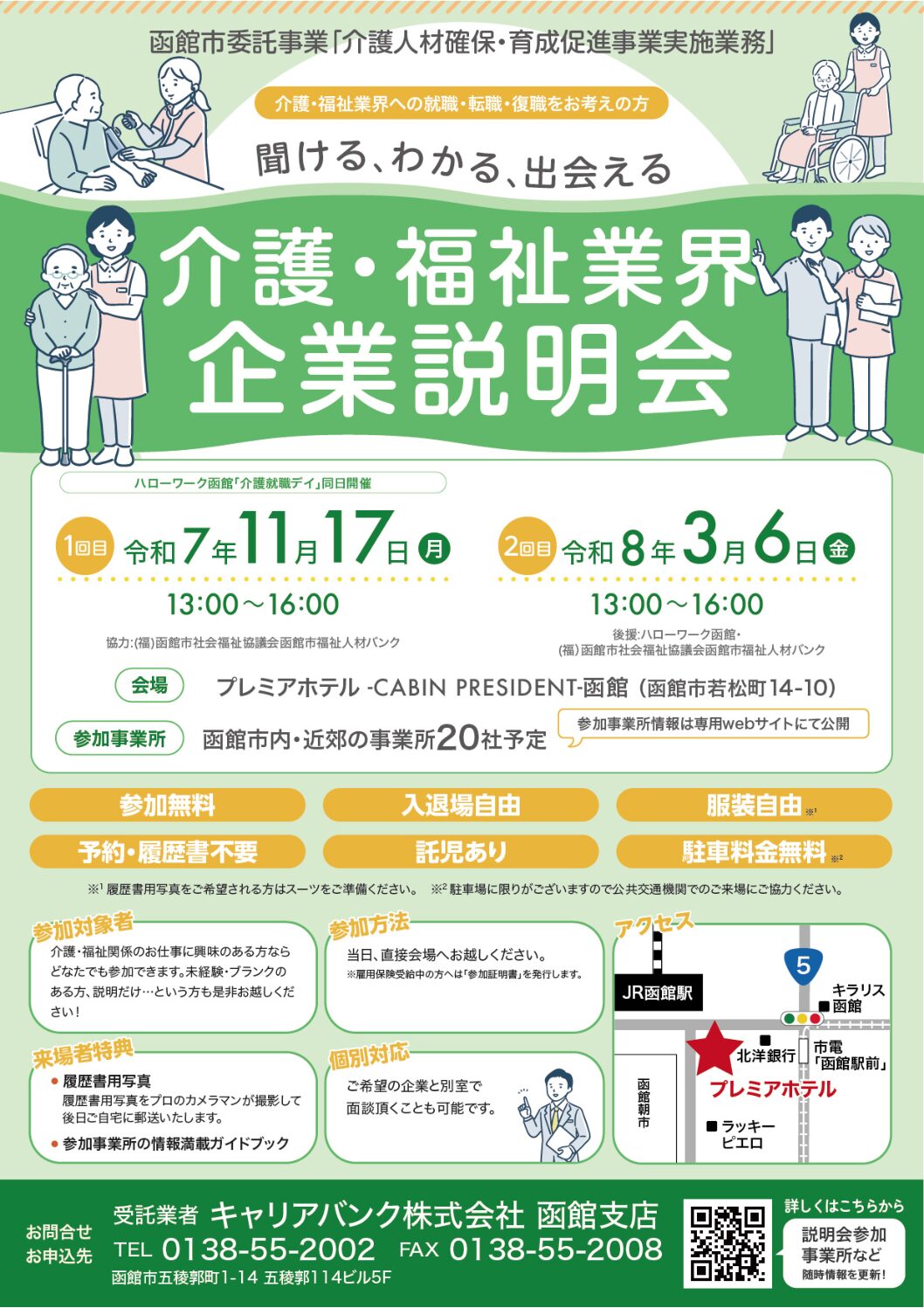 キャリアバンクキャリアバンク株式会社 函館支店様より研修案内が届きましたのでお知らせいたします。 函館市委託事業:介護人材確保・育成促進事業実施業務 介護・福祉業界企業説明会 函館市内・近郊の事業所が参加する企業説明会を…