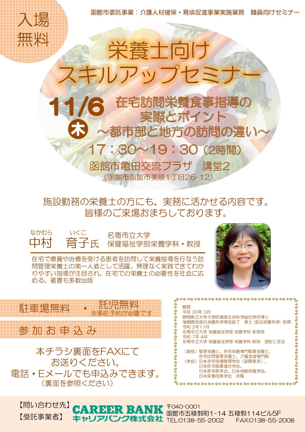 キャリアバンク株式会社 函館支店様より研修案内が届きましたのでお知らせいたします。 函館市委託事業:介護人材確保・育成促進事業実施業務 栄養士向けスキルアップセミナー 名寄市立大学 中村育子教授をお招きし,介護事業所に勤…