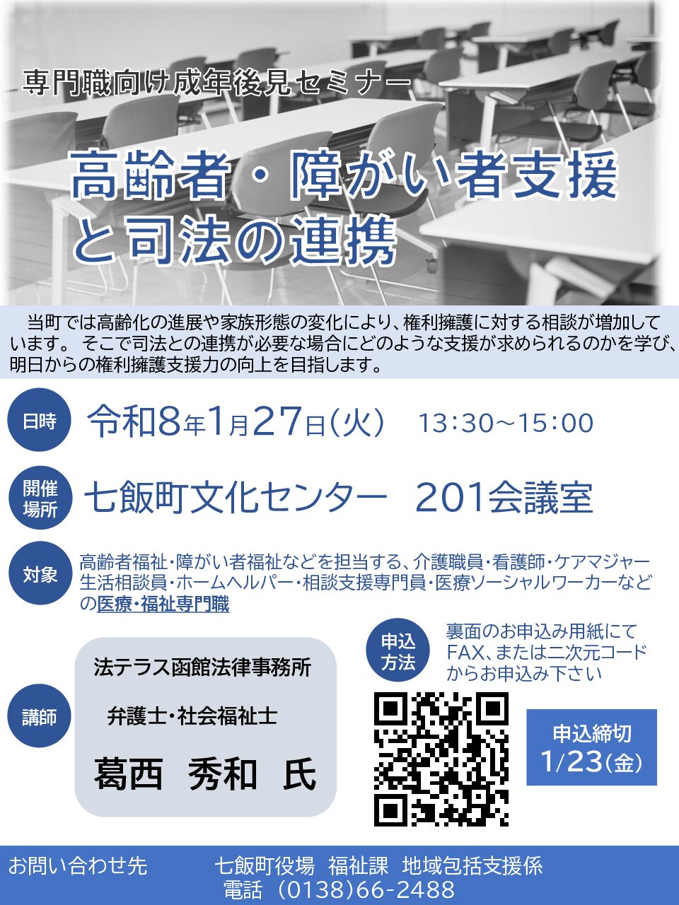 - 研修案内【R8年1月27日開催】専門職向け成年後見セミナー 高齢者・障がい者支援と司法の連携