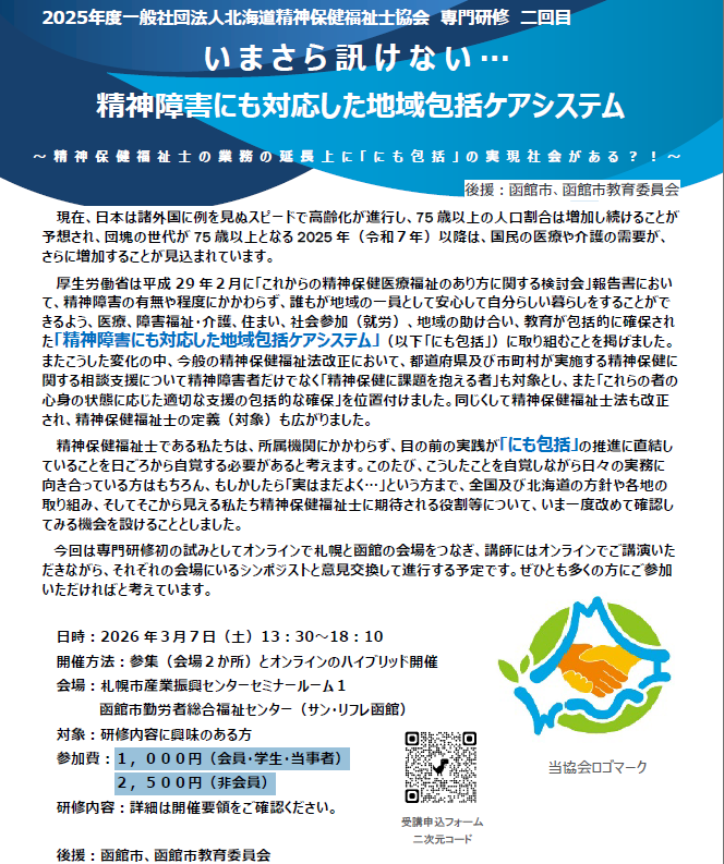 - 研修案内【R8年3月7日開催】「2025年度 一般社団法人 北海道精神保健福祉士協会 専門研修 二回目」